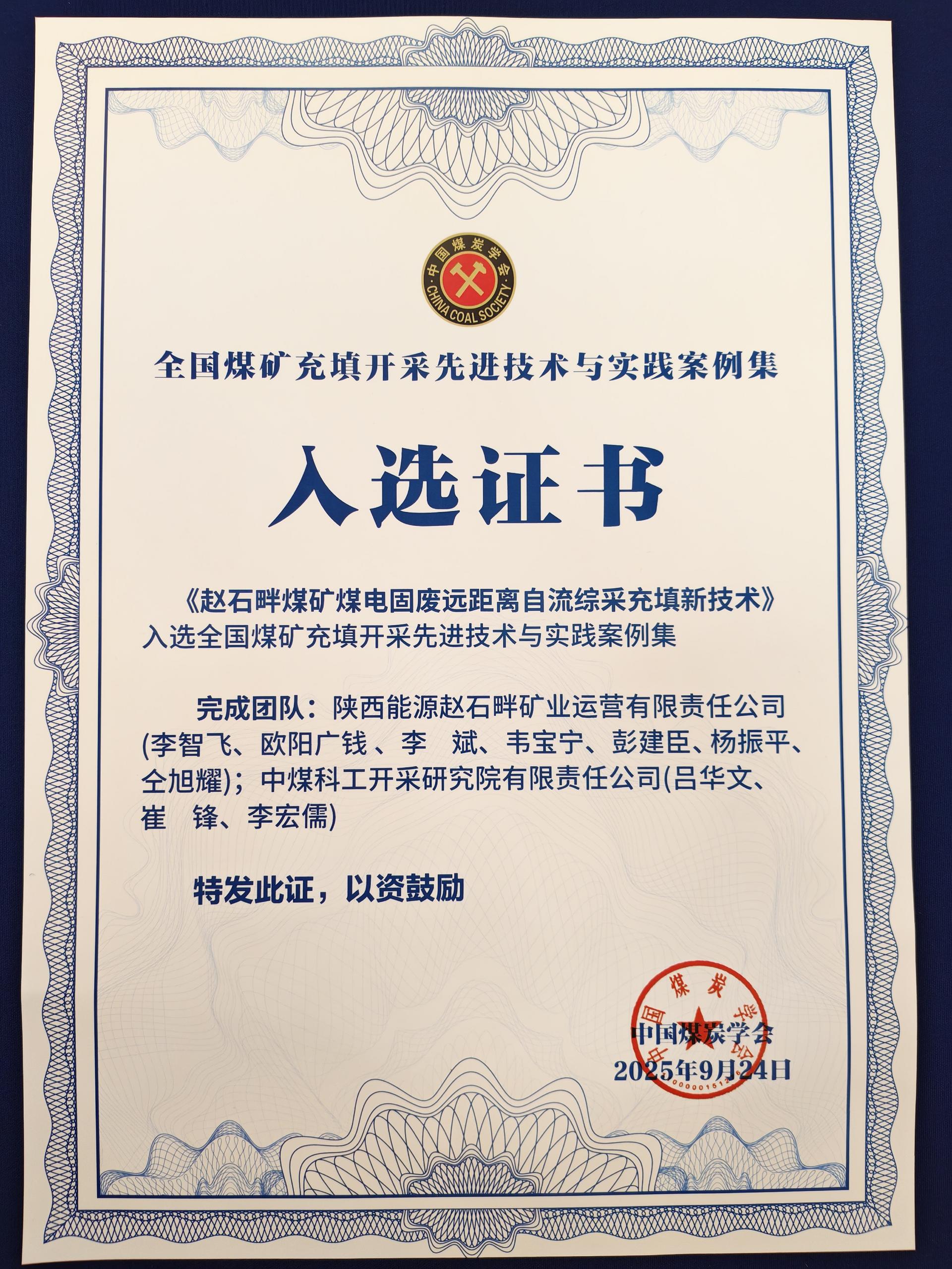 9月24日,从中国煤炭学会传来喜讯——“赵石畔煤矿煤电固废远距离自流综采充填新技术”成功入选全国煤矿充填开采先进技术与实践案例,标志着公司在绿色开采与循环经济发展方面走在了行业前列。